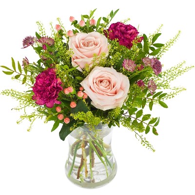 En sjarmerende bukett med blomster som roser, nelliker og astrantia sammen med sesongens grønne. De lyserosa blomstene står i vakker kontrast til de intense rosanyansene som virkelig popper. Denne buketten er perfekt når du vil gjøre en spesiell dag enda mer minneverdig. Buketten er et eksklusivt dekoratørhåndverk, og blomstene er nøye utvalgt for å sikre høy kvalitet. Hver bukett er unik og bindes ut fra sortiment og sesong – men beholder alltid sin farge og form. Buketten leveres av lokal dekoratør.