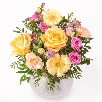 Søt bukett med blomster slik som roser, germinis og nelliker sammen med sesongens grønne. Med sine vakre nyanser av aprikos og lys lilla sjarmere denne gylne buketten hvem som helst. Perfekt til bursdager, årsdager og andre spesielle anledninger. Buketten er et eksklusivt dekoratørhåndverk, og blomstene er nøye utvalgt for å sikre høy kvalitet. Hver bukett er unik og bindes ut fra sortiment og sesong – men beholder alltid sin farge og form. Buketten leveres av en lokal dekoratør.